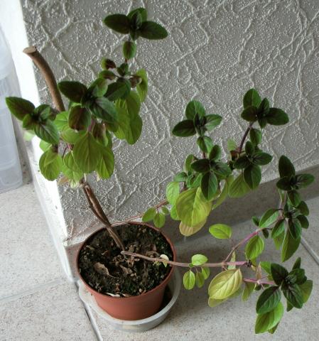 Die Pflanze ist bereits gut verholzt. Eigentlich war sie für den Garten vorgesehen, nachdem ich aber gelesen hatte, dass Basilikum wohl eine Schneckenleibspeise sein soll, habe ich es gelassen.