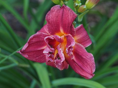 2 Fächer dieser Taglilie. Sie blüht rot mit gefüllter Blüte. Das Foto ist leider nicht so schön. Die Fächer sind zurückgeschnitten.