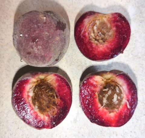 1) Roter Weinbergpfirsich (1. Foto): Standardsorte. Schale dunkelrot, Fruchtfleisch dunkelrot, tiefroter Saft, typisches, charakteristisches Weinbergpfirsicharoma