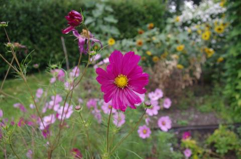 Cosmea wird von Schnecken geliebt, deswegen wachsen sie bei mir im schneckenfreien Gemüsebeet. Dort locken sie unzählige Insekten an. Samt sich gern selbst aus.