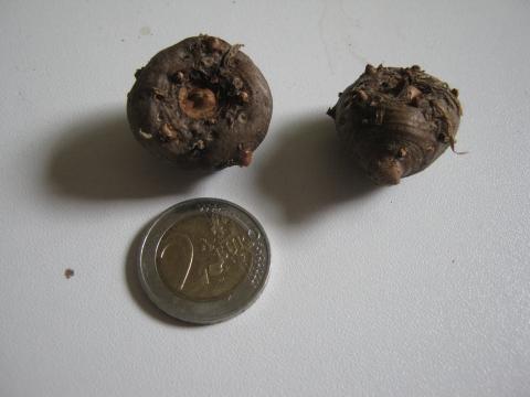 Biete die hier abgebildeten Knollen von Amorphophallus konjac an. das 2 Euro Stück dient dem Größenvergleich.