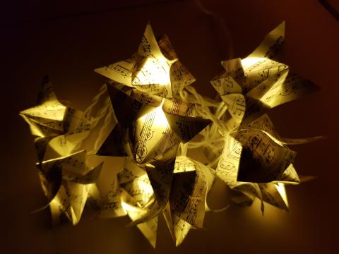Tausche die abgebildete Lichterkette, 10 Lichter, mit Netzstecker und Schalter, Blüten im Origami'Stil aus Notenpapier, neu