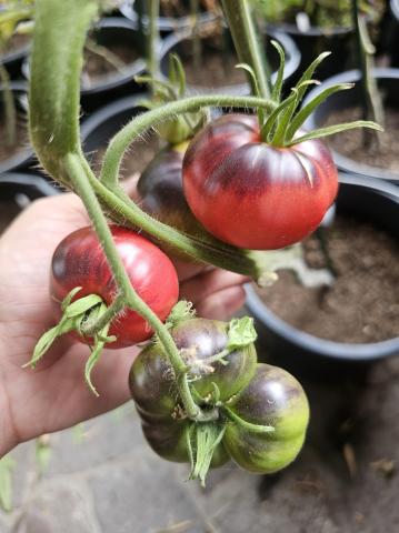 Eine blau-rosane Fleischtomate mit fruchtig, süßem Geschmack.