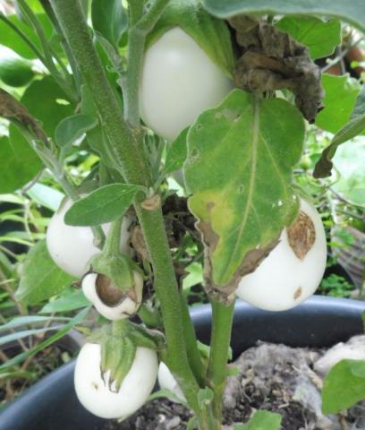 Eine Aubergine mit vielen hühnereigroßen weißen Früchten.Schade, dass diese Früchte noch nicht zu Ostern reif sind. :-D