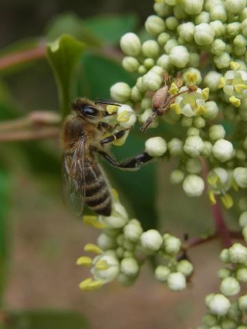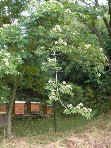 Das Besondere an diesem Baum ist die sehr späte Blüte ( Jul-Sept) Weiße Blütendolden (ähnlich wie Hollunder), welche reichlich Nektar und Pollen liefern und das in einer Jahreszeit, wo die meisten anderen größeren Nektar- und Pollenquellen bereits versiegt sind. Dies macht den blühenden Baum zu einem Magnet für die Bienen und viele andere Blütenbesucher. Bei gutem Wetter scheint dann der ganze Baum zu Summen. Eine super Spättrachtpflanze.