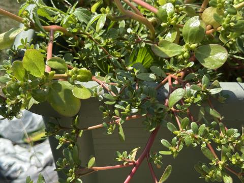 Ein toller Sommerportulak, den ich auf unserer Wiese entdeckt habe. Riesenblätter und richtig dicke, rot überhauchte Stängel. Selbst die Samen sind größer als unsere normalen Portulak-Samen. (Im Bild zum Vergleich mit der zarteren Wildform)