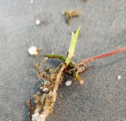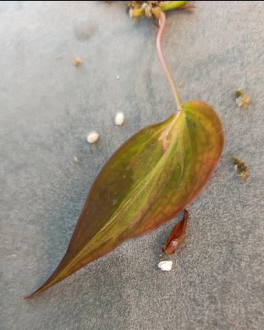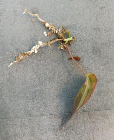 Bewurzelter Ableger mit Austrieb Philodendron micans halo variegata, der bereit zum Einpflanzen ist