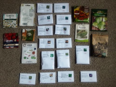 Saatgutreste. Ich säe immer nur wenig aus, deshalb sind die meisten Tüten noch gut gefüllt. Hinten steht das Haltbarkeitsdatum, soweit vorhanden. Das Saatgut wurde zum Großteil in den Jahren 23 und 24 gekauft.