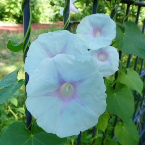 Zartblaue, fast weiße Blüten mit etwas Rosa in der Mitte.