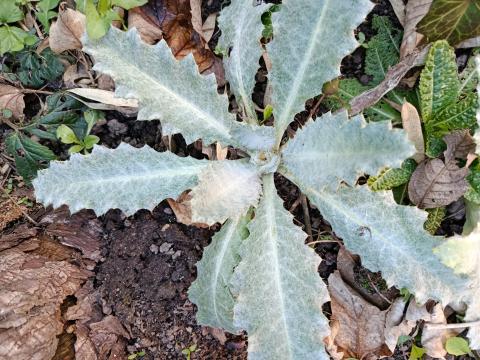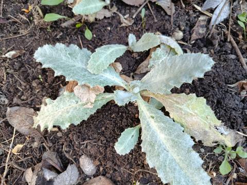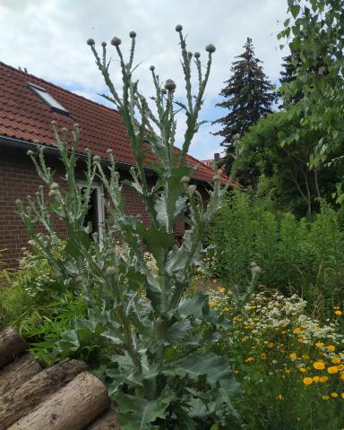Hohe silberfilzige Distel zum Schmuck im Garten, zieht Insekten an.