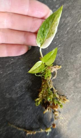 Ableger der Epipremnum pinnatum Créme Brûlée, leicht bewurzelt und Austrieb, mit schöner Panaschierung