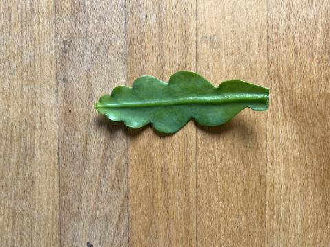 Kleines frisches Blatt. Versand trocken, da die Schnittfläche ohnehin vor dem ersten einpflanzen angetrocknet sein soll. Nach meinen Erfahrungen wurzeln die Ableger auch noch nach Wochen. Dieser ist frisch!