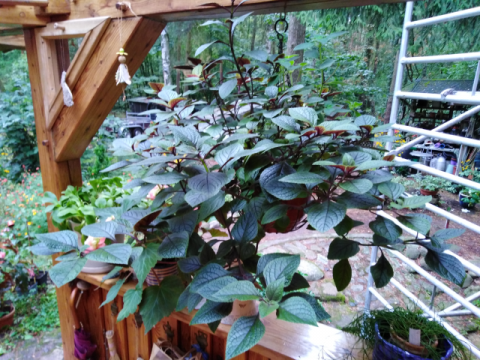 Dieser schöne Mottenkönig hat dunkelgrüne Blätter, die Unterseiten sind rotviolett. Ich kombiniere diese Blattpflanze mit langtriebigem Männertreu. Die Blätter riechen würzig, wahrscheinlich wurden sie gegen Kleidermotten eingesetzt. Diese Pflanzengattung ist eng mit Basilikum verwandt.