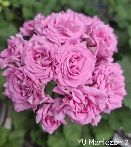 Jungpflanze der osteuropäischen Sorte YU Merlezon 2, die berauschend mit Rosenblüten in einem kräftigen Rosaton blüht. Sie ist den ganze Sommer sehr verlässlich am Blühen.