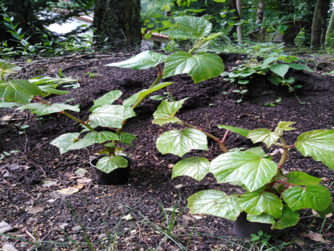 Diese Begonie hat mittelgrüne Blätter, die an Weinblätter erinnern. Ich biete hier zwei bewurzelte Stecklinge an. Von Mai bis Oktober steht sie draußen im Halbschatten und dann bei 5 -15°C im Gewächshaus oder in einem hellen Raum.